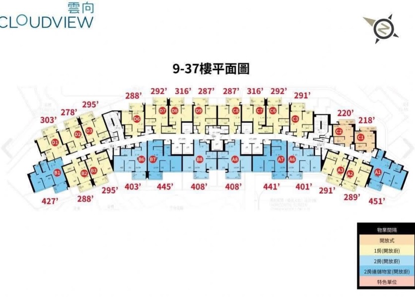 「雲向(Cloudview)位於沙田、大埔及北區的核心區域,位置介於粉錦公路663號,由永泰亞洲發展。項目 comprises 1 座樓宇,提供共765個住宅單位,實用面積介乎196至868平方呎,戶型涵蓋由開放式至3房之多元格局,滿足不同家庭與住戶的需求。